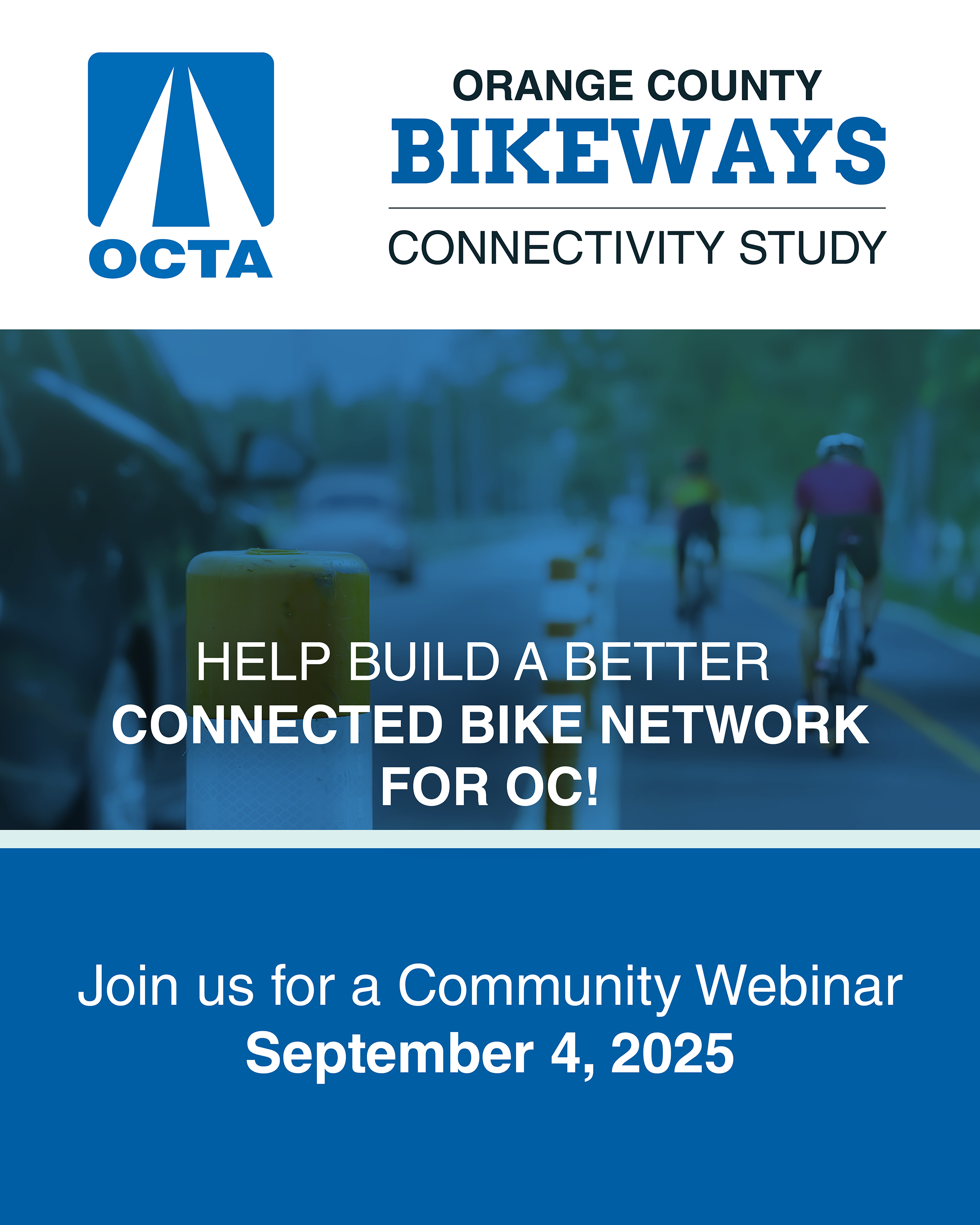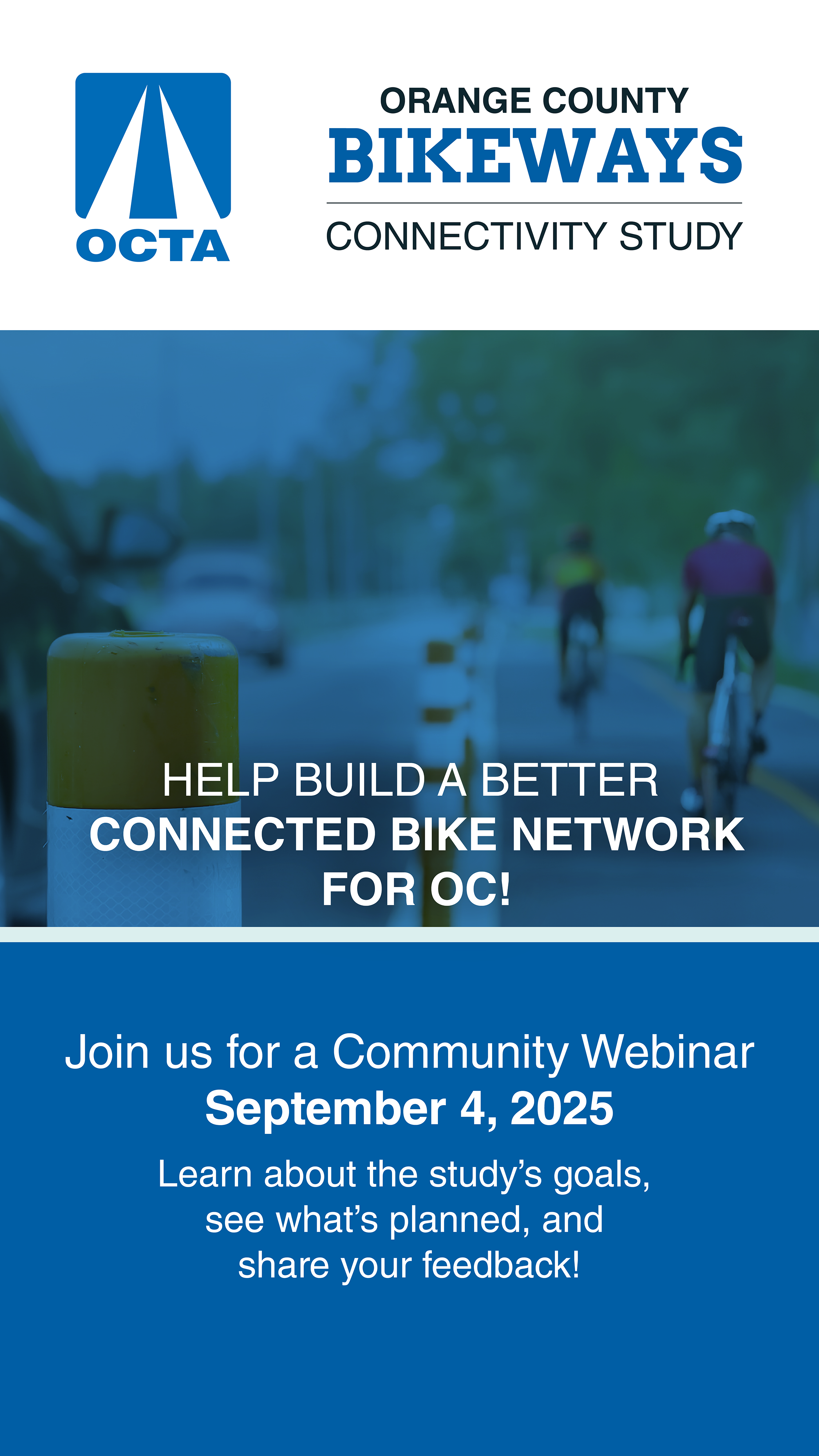 The Orange County Transportation Authority (OCTA) is preparing the Bikeways Connectivity Study to identify opportunities for improving bicycle safety and connectivity across Orange County. The study will identify streets on the Master Plan of Arterial Highways (MPAH) that could potentially accommodate Class IV bikeways—physically separated bike lanes that create more reliable and comfortable riding conditions. Building on previous planning efforts, this study aims to support expansion of the regional bikeways network by working closely with community stakeholders and local jurisdictions. It will also include public events to promote cycling and educate residents on the benefits of separated bikeways.