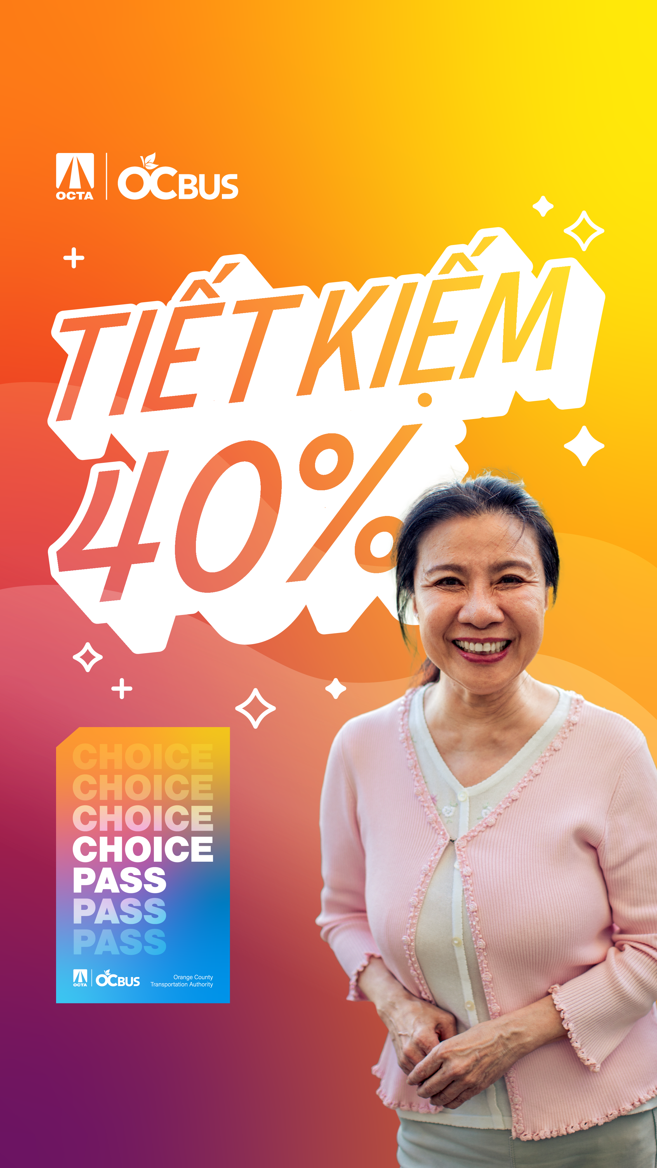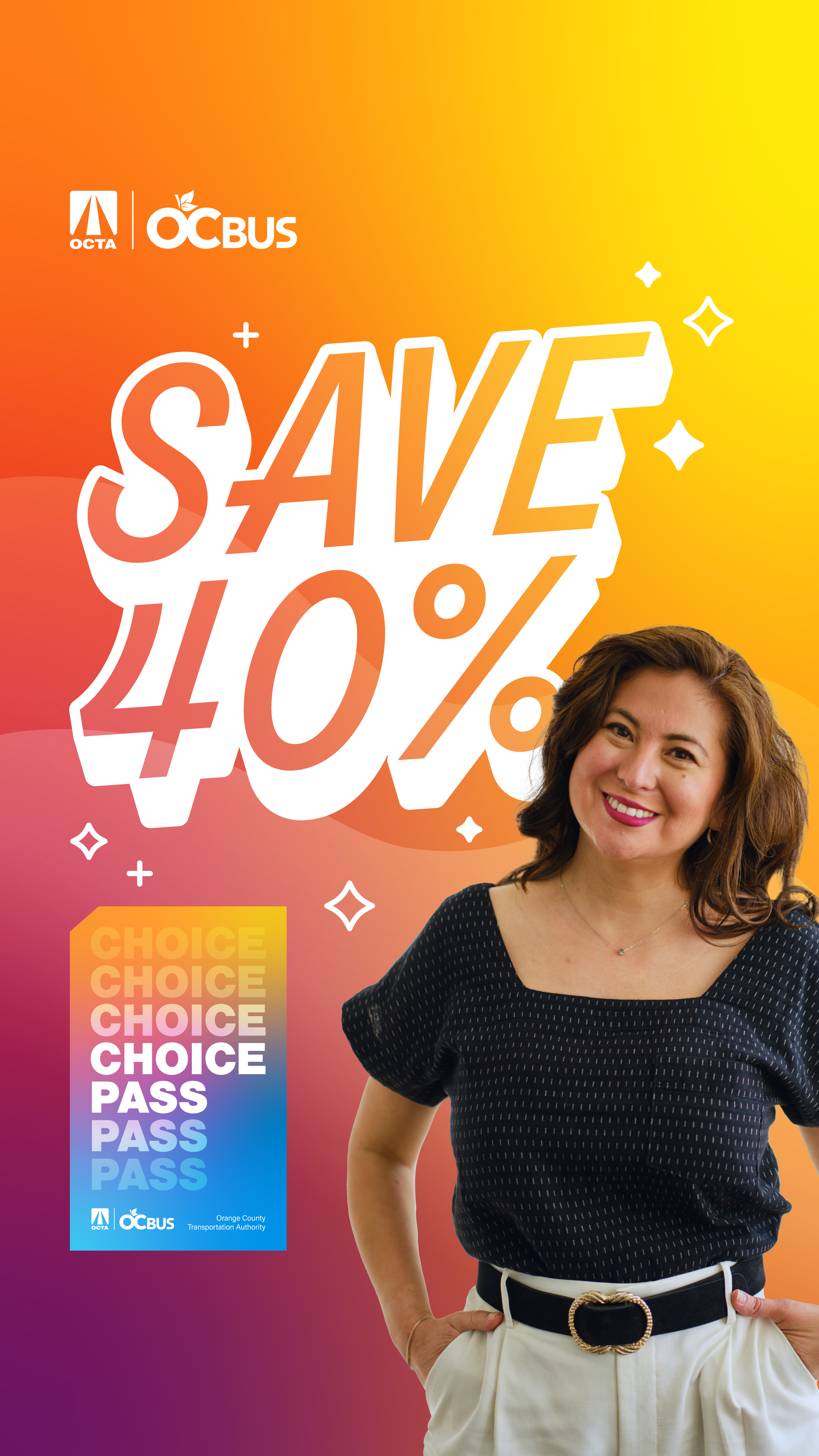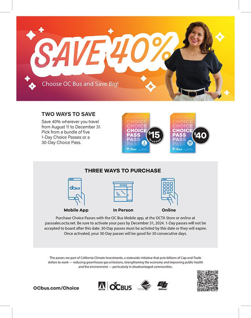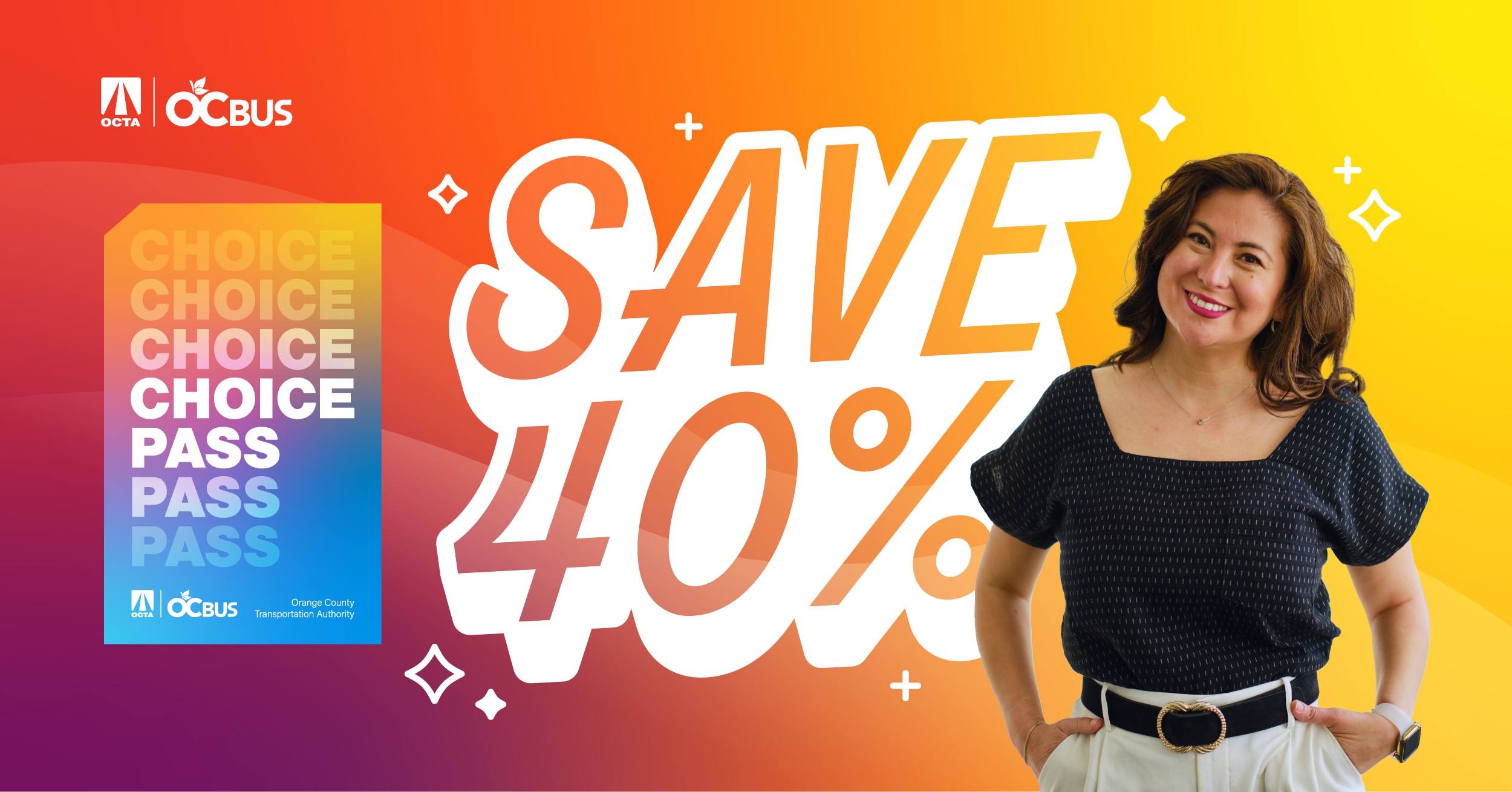 Save 40% on OC Bus with the new Choice Pass from August 11 to December 31. Get 1-day and 30-day passes for trips throughout Orange County.
