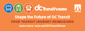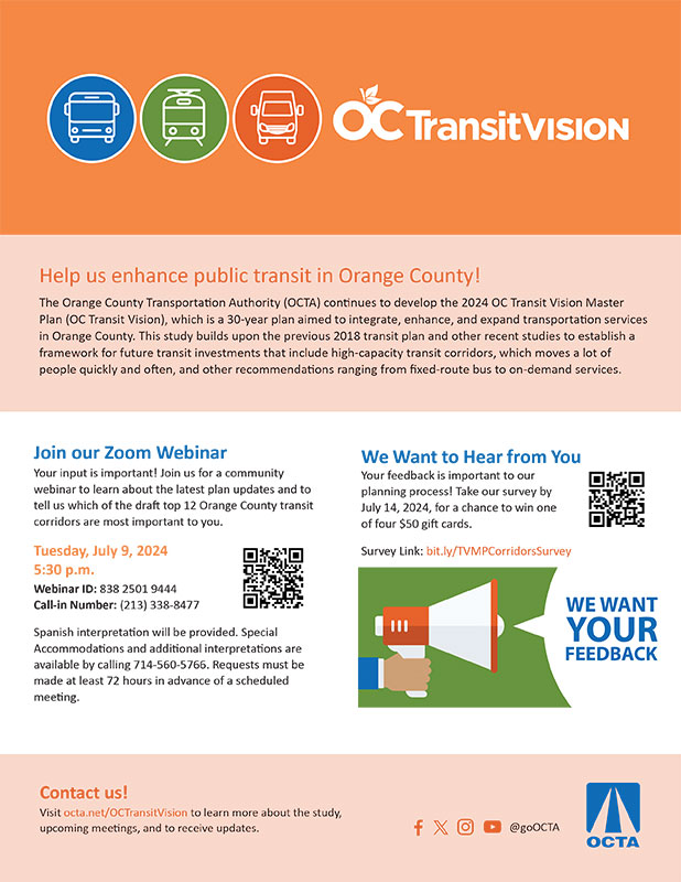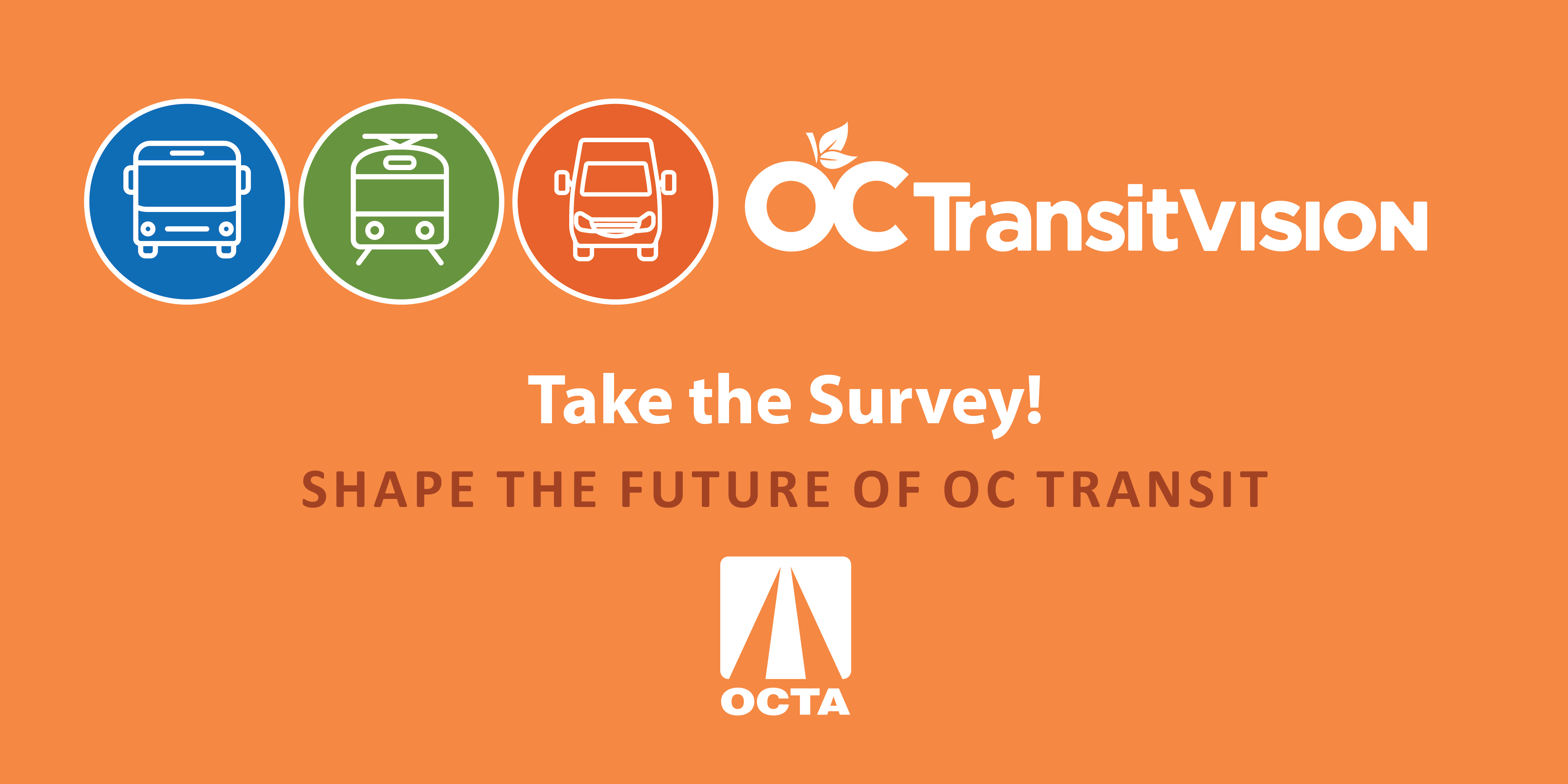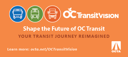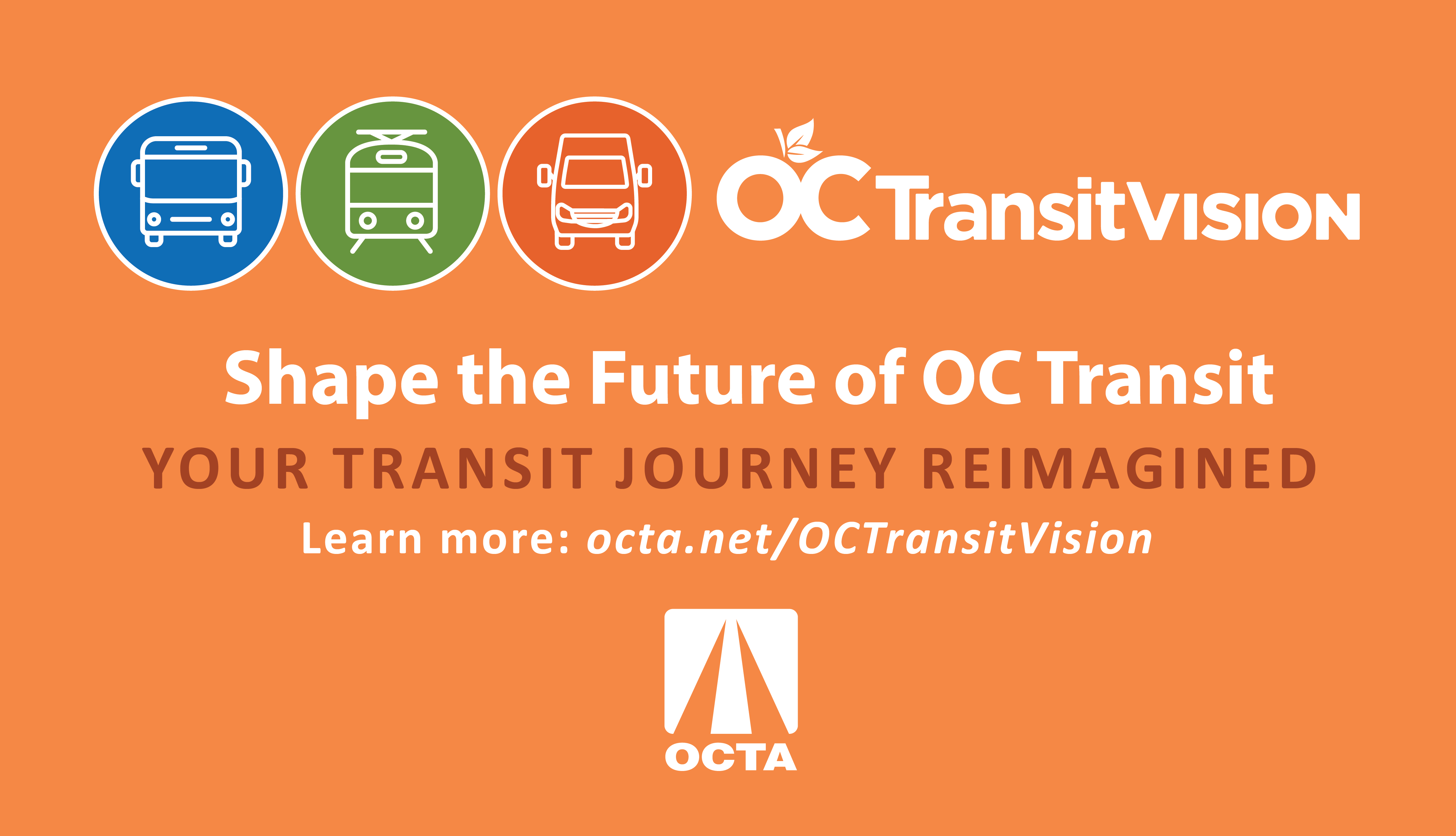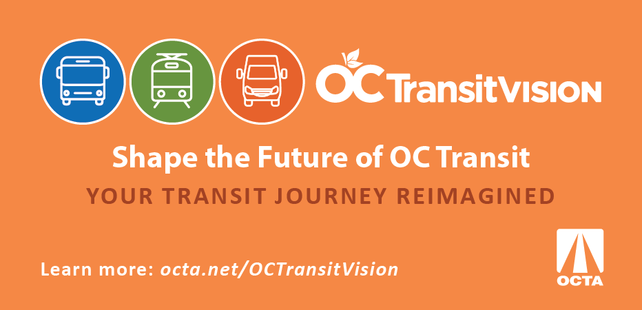 The Orange County Transportation Authority (OCTA) is developing the 2024 OC Transit Vision Master Plan (OC Transit Vision), a 30-year plan aimed to integrate, enhance, and expand multimodal transportation services in Orange County. This May through July, OCTA is asking the public which of the top 12 OC transit corridors are most important to them. The online survey is offered in English, Spanish and Vietnamese.