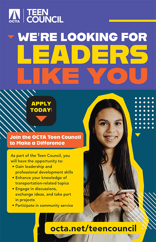 The OCTA Teen Council offers high school students in Orange County an opportunity to learn about transportation-related projects. Members focus on building leadership, communication, and teamwork skills.