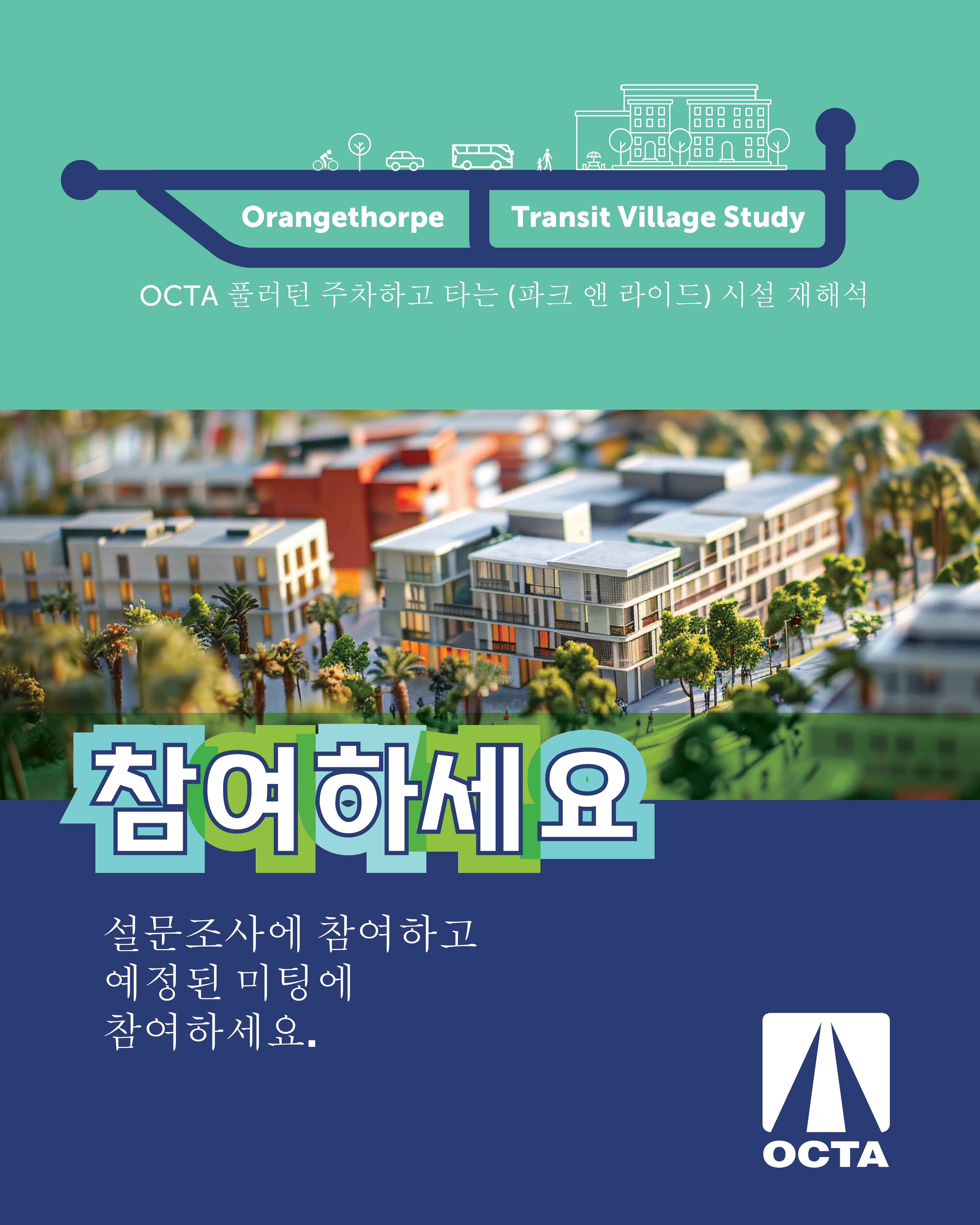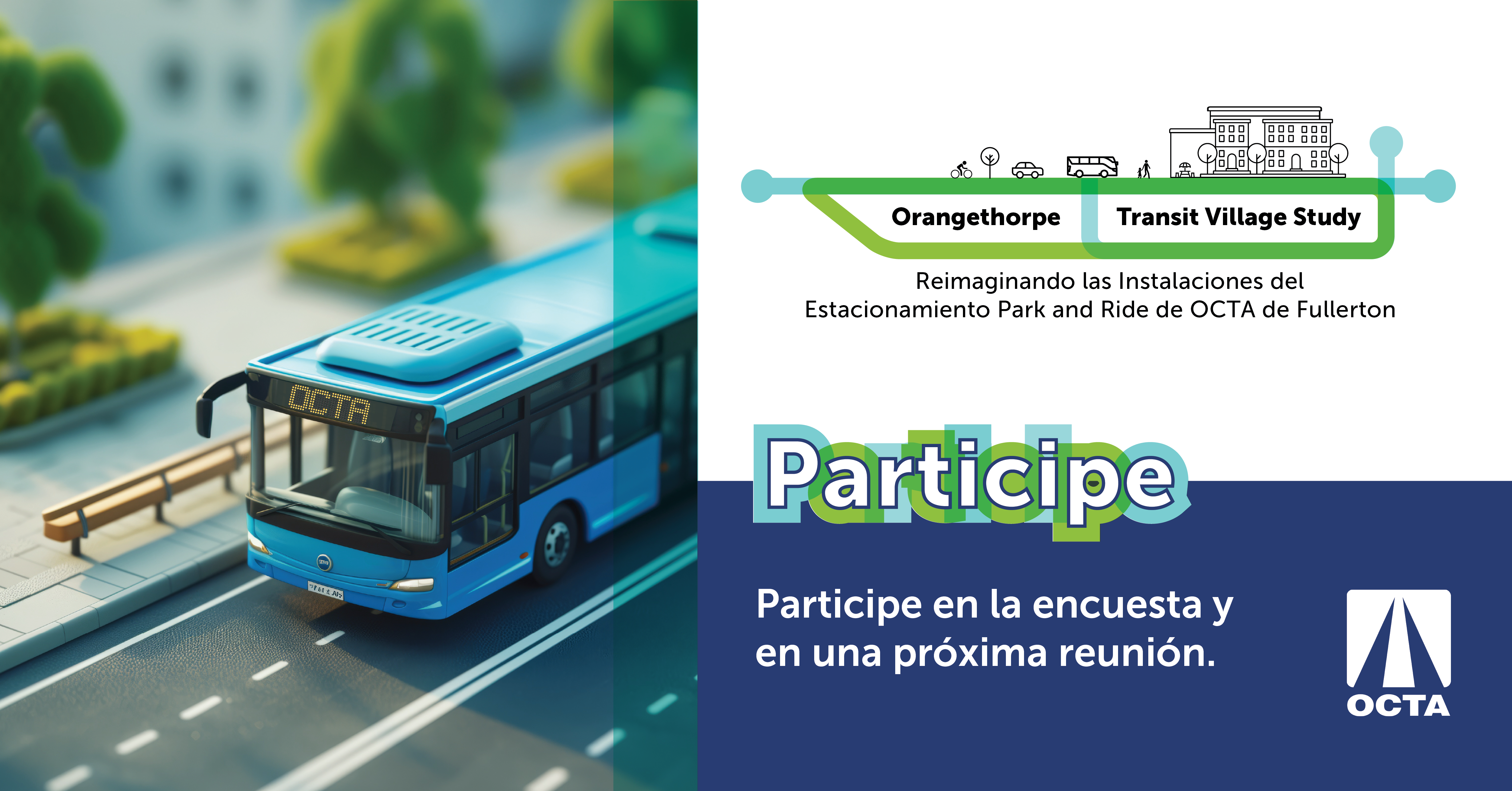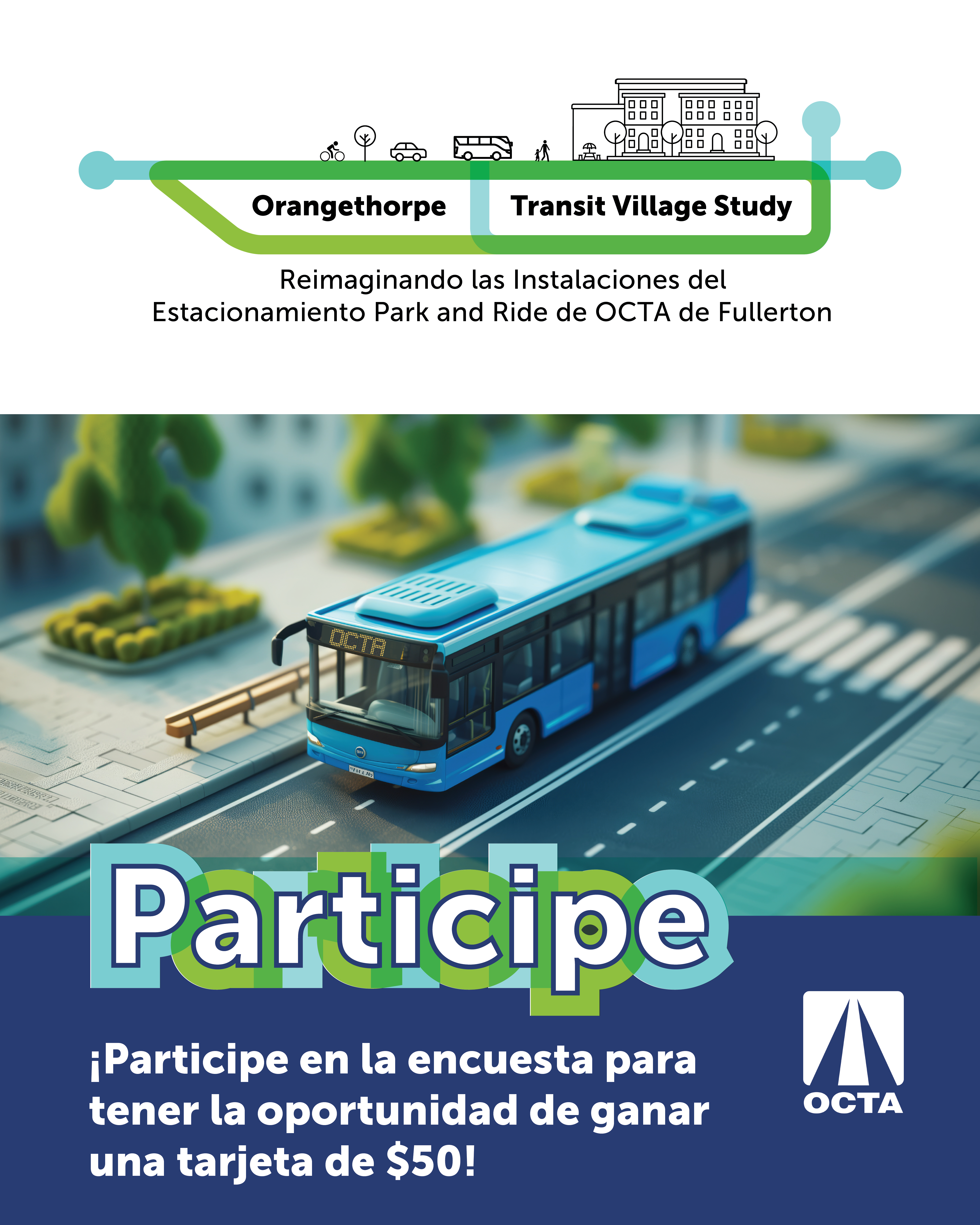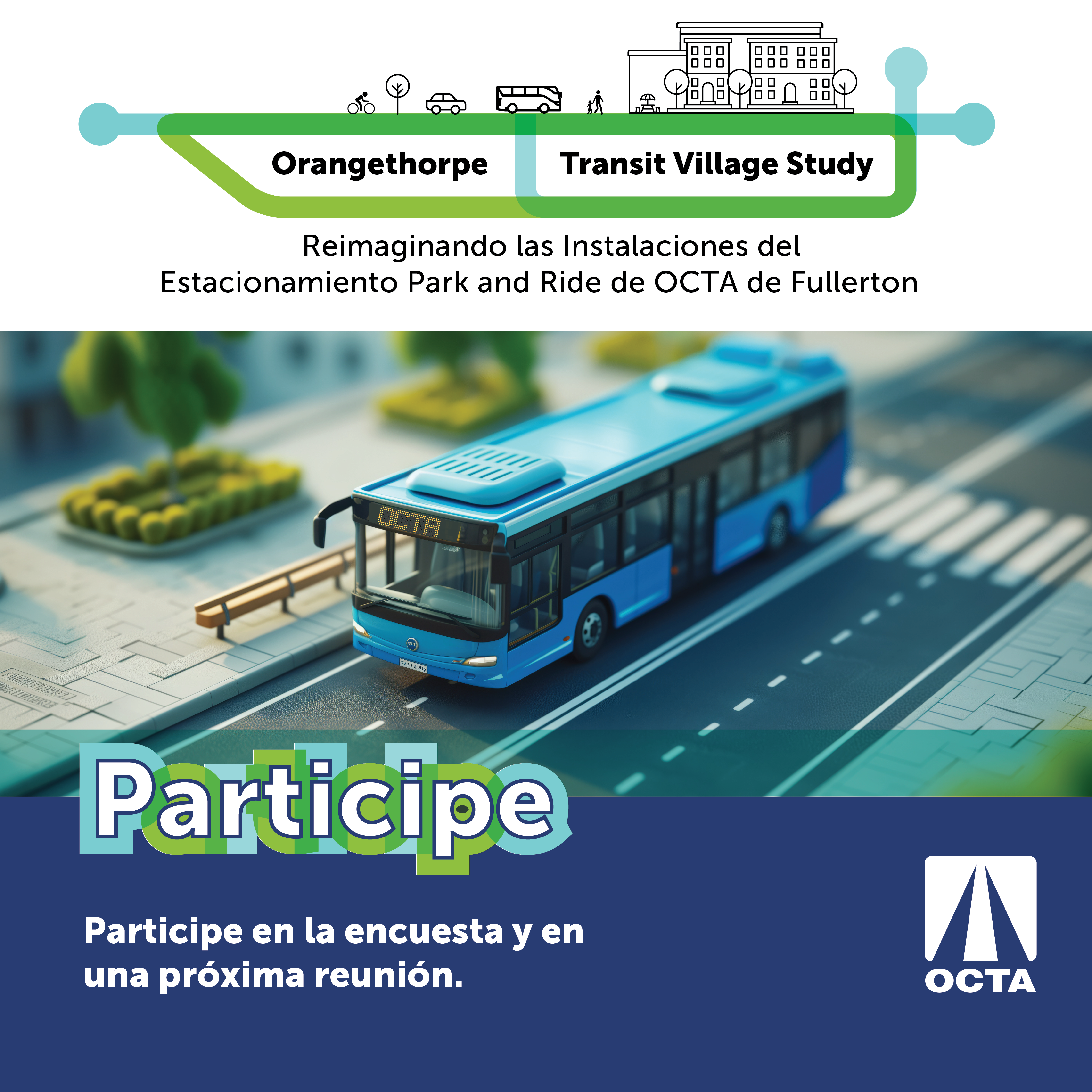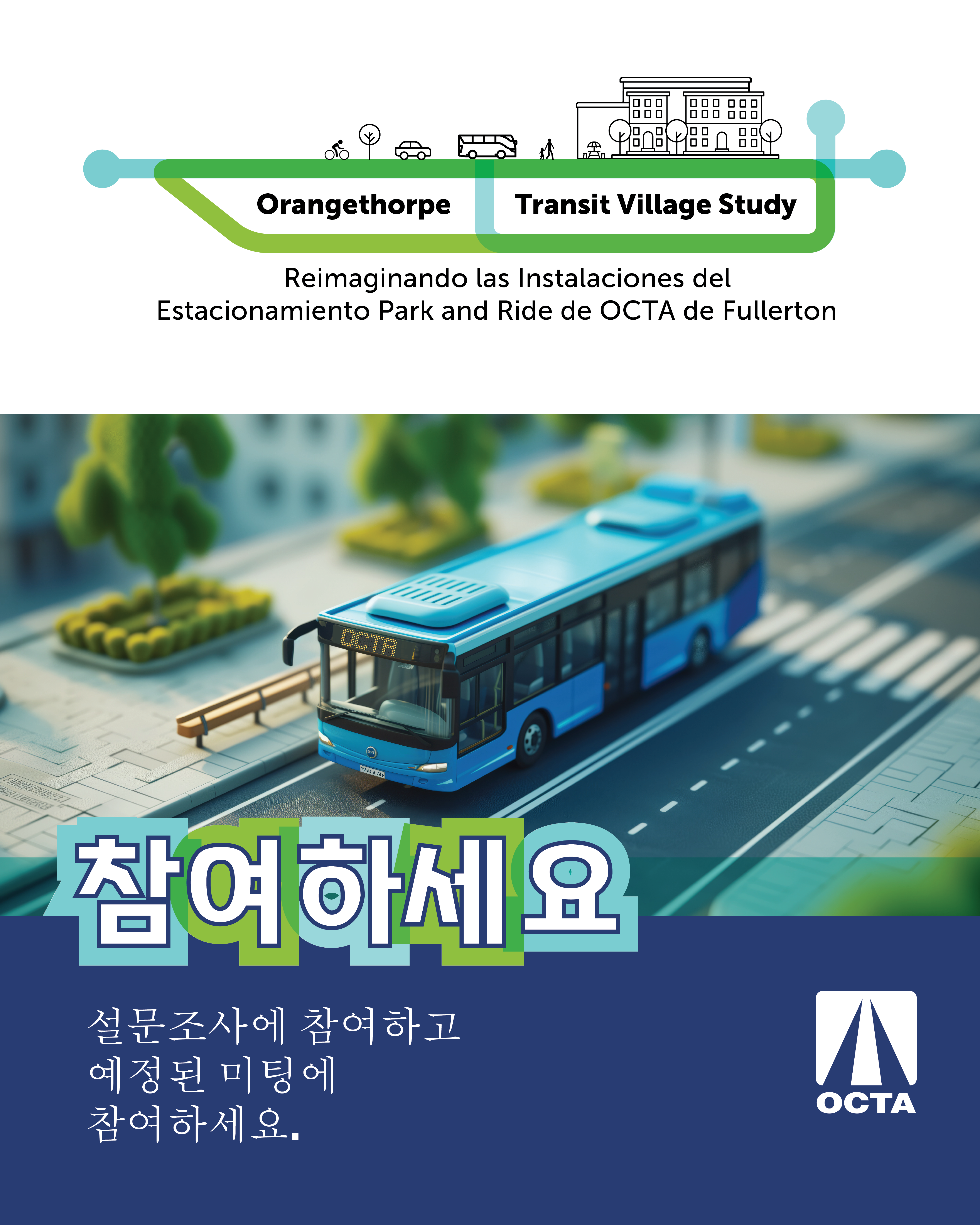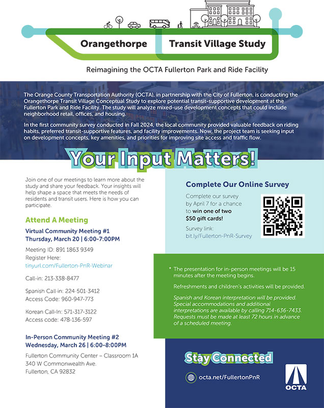 The Orange County Transportation Authority (OCTA), in partnership with the City of Fullerton, is conducting the Orangethorpe Transit Village Conceptual Study (Study) that will explore the potential for transit-supportive development at the Fullerton Park and Ride Facility. The Study will analyze mixed-use development concepts that could include neighborhood retail, offices, and housing. The Study intends to preserve the transit and park and ride functions at the site while enhancing the sense of community and place, complementing surrounding developments, increasing access to sustainable mobility options, and improving the transit rider experience.