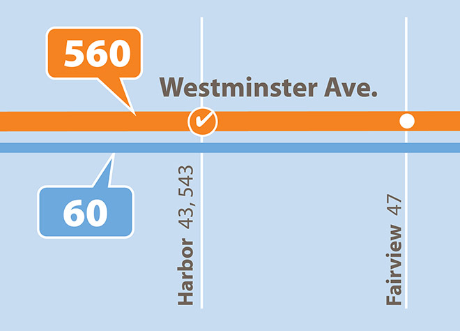Route 560 serves 12 stops along Westminster Blvd/17th Street, providing faster service between Westminster and Santa Ana.