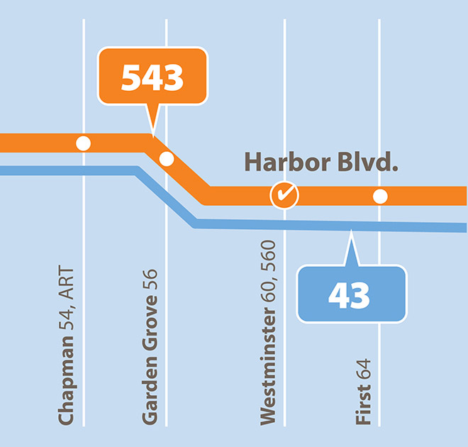 Route 543 serves 16 stops along Harbor Blvd., providing faster service between Fullerton and Santa Ana.