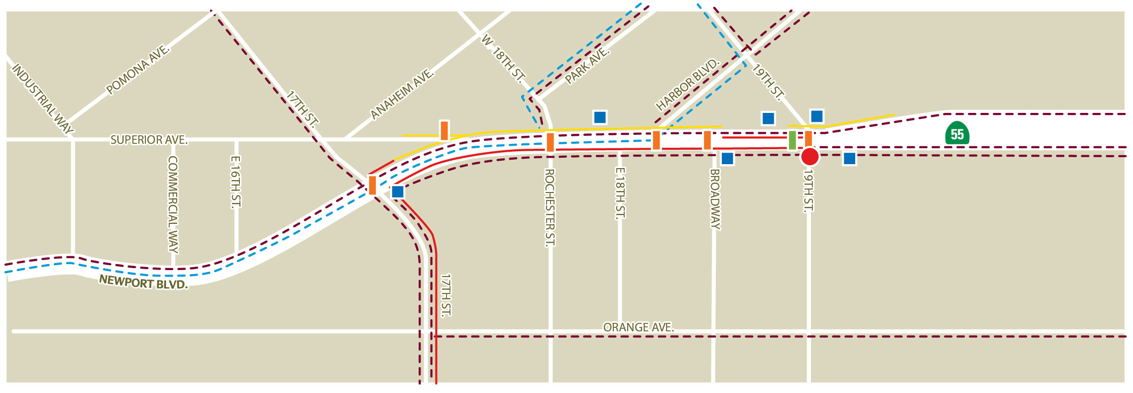 This effort was a continuation of the 2008 SR-55 Access Study, which identified four alternatives for further study (No Build, TSM, Elevated Turn Lanes, and Cut and Cover). The effort analyzed these alternatives in greater depth and identified initial scope, schedule, and cost considerations for the next phase of the project development process — completion of an environmental document.